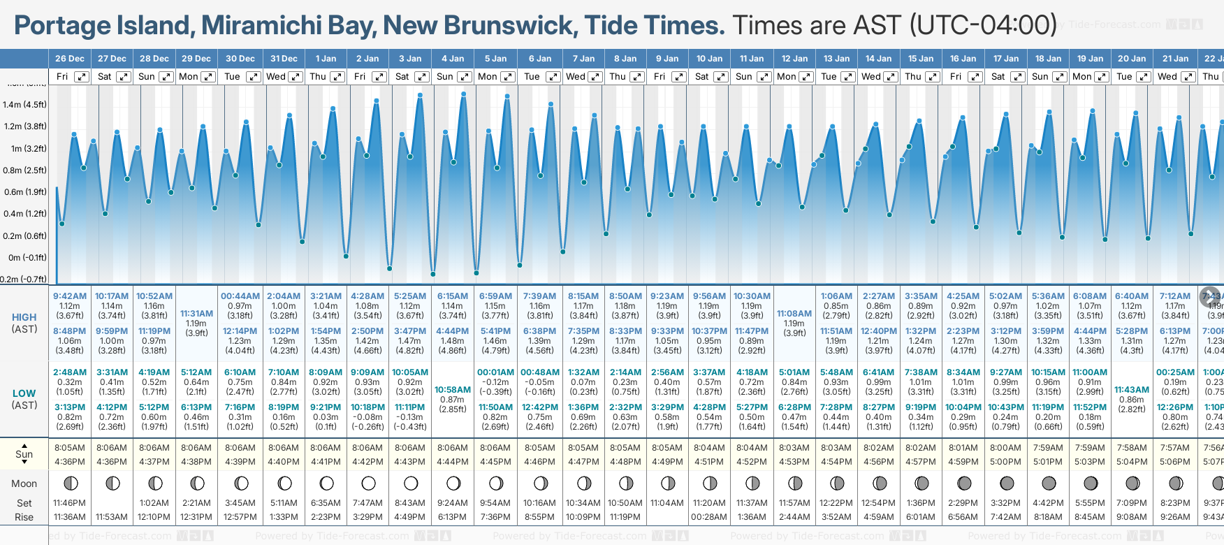 Tide chart for Portage Island, Miramichi BayShowing low and high tide times for the next 30 days at Portage Island, Miramichi Bay. Tide Times are AST (UTC -4.0hrs).