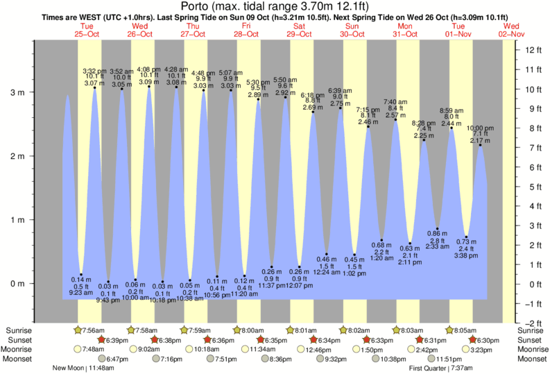 Tide Times are WET (UTC +0hrs). Last Spring High Tide at Porto was on Sat 06 Dec (height: 3.21m 10.5ft). Next high Spring Tide at Porto will be on Mon 22 Dec (height: 2.81m 9.2ft).