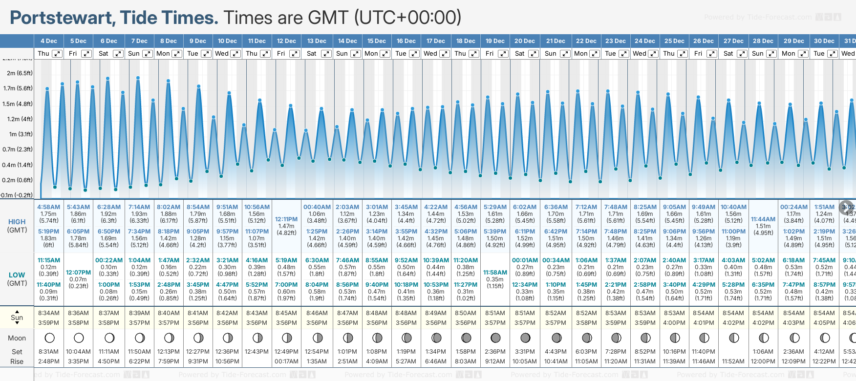 December Tide charts for Portstewart: The tide charts below show the height, time and date of high and low tides for the next 30 days.