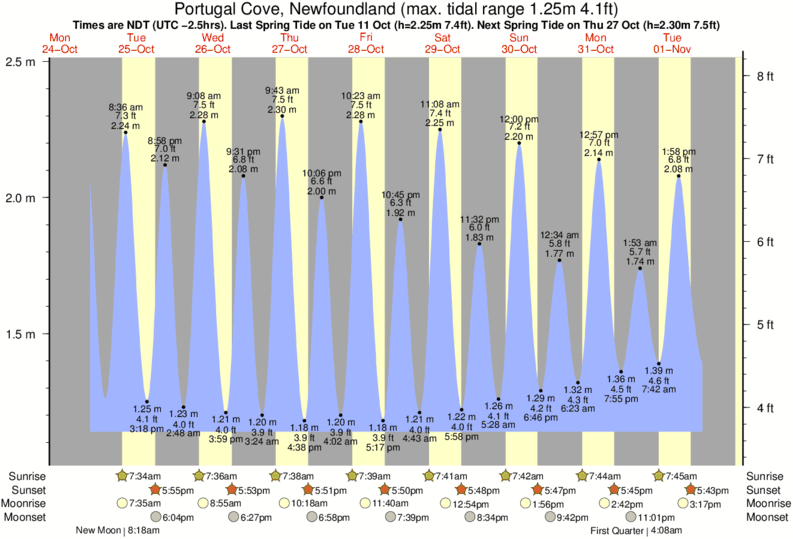 Tide Times are NST (UTC -3.5hrs). Last Spring High Tide at Portugal Cove was on Fri 05 Dec (height: 2.41m 7.9ft). Next high Spring Tide at Portugal Cove will be on Sun 21 Dec (height: 2.23m 7.3ft).