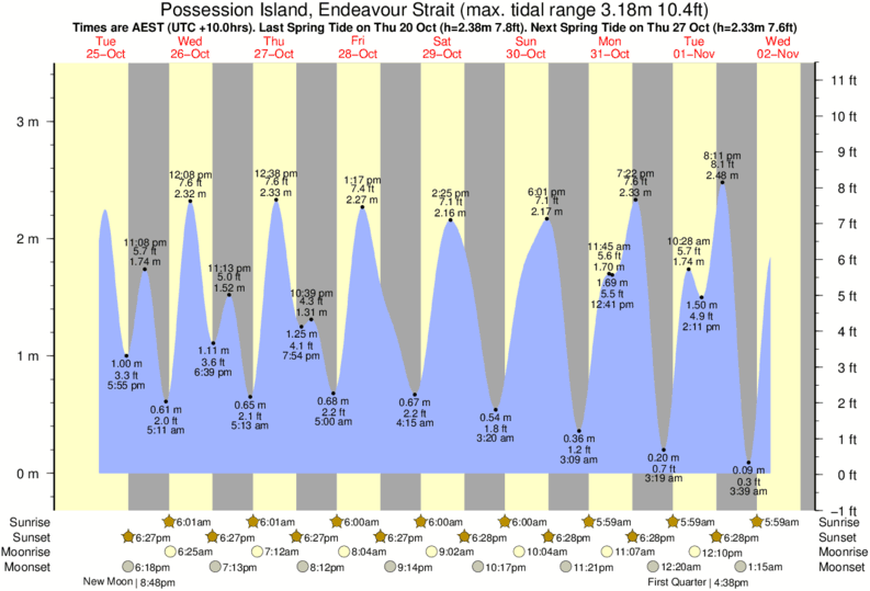 Tide Times are AEST (UTC +10.0hrs). Last Spring High Tide at Possession Island was on Fri 05 Dec (height: 2.88m 9.4ft). Next high Spring Tide at Possession Island will be on Sat 03 Jan (height: 3.14m 10.3ft).