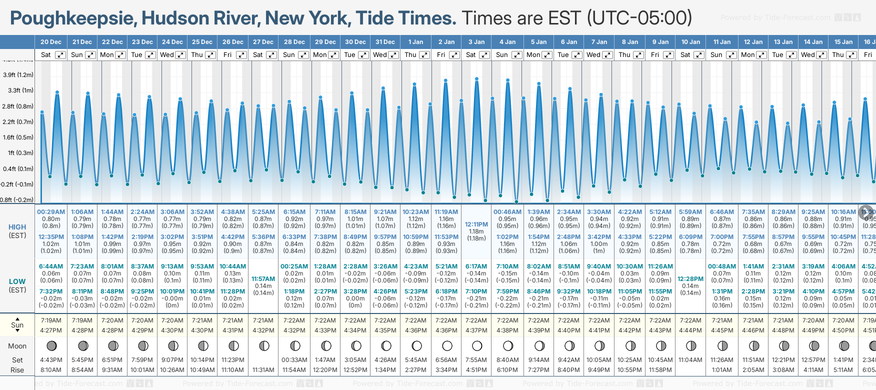 December and January Tide charts for Poughkeepsie, Hudson River: The tide charts below show the height, time and date of high and low tides for the next 30 days.
