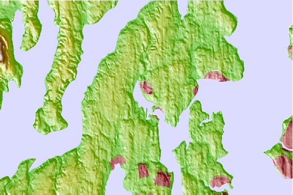 Use this relief map to navigate to tide stations, surf breaks and cities that are in the area of Poulsbo, Liberty Bay, Washington.