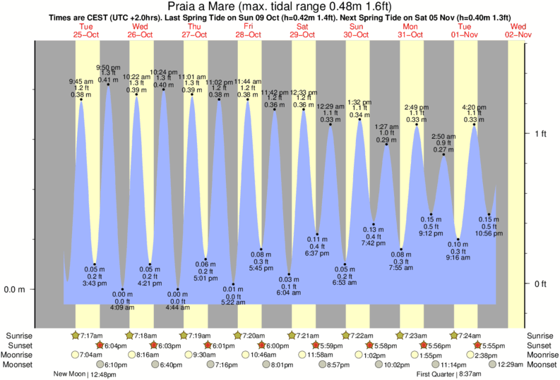 Tide Times are CET (UTC +1.0hrs). Last Spring High Tide at Praia a Mare was on Sun 07 Dec (height: 0.41m 1.3ft). Next high Spring Tide at Praia a Mare will be on Mon 22 Dec (height: 0.37m 1.2ft).