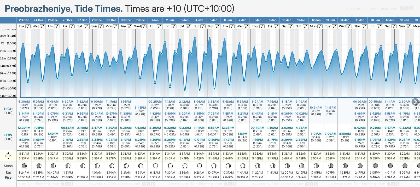 December and January Tide charts for Preobrazheniye: The tide charts below show the height, time and date of high and low tides for the next 30 days.