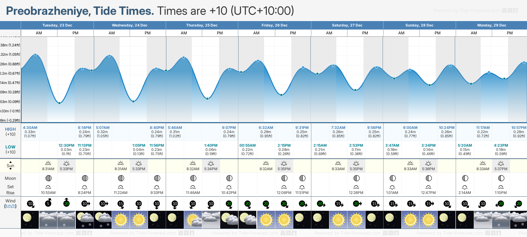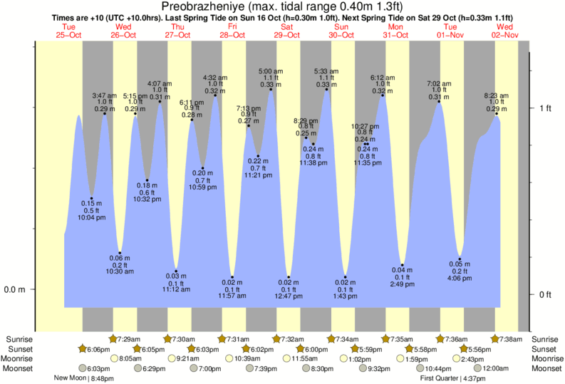 Tide chart for PreobrazheniyeShowing low and high tide times for the next 30 days at Preobrazheniye. Tide Times are +10 (UTC +10.0hrs).