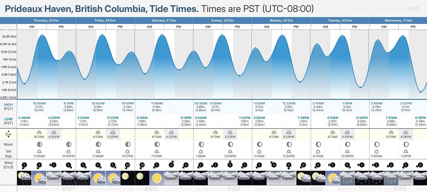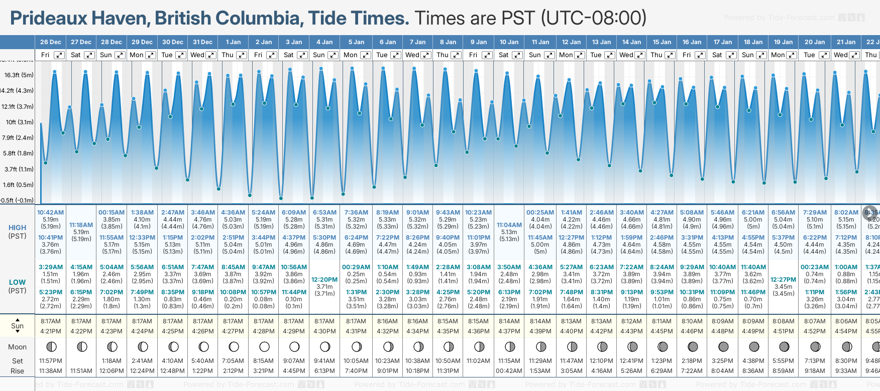 Tide Times are PST (UTC -8.0hrs). Last Spring High Tide at Prideaux Haven was on Fri 05 Dec (height: 5.30m 17.4ft). Next high Spring Tide at Prideaux Haven will be on Fri 26 Dec (height: 5.19m 17.0ft).