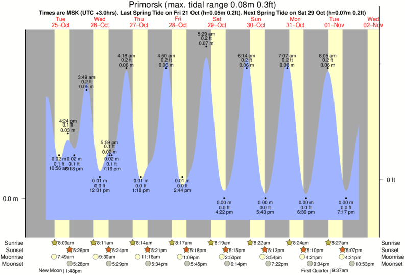 Tide Times are MSK (UTC +3.0hrs). Last Spring High Tide at Primorsk was on Sun 07 Dec (height: 0.08m 0.3ft). Next high Spring Tide at Primorsk will be on Sat 20 Dec (height: 0.07m 0.2ft).