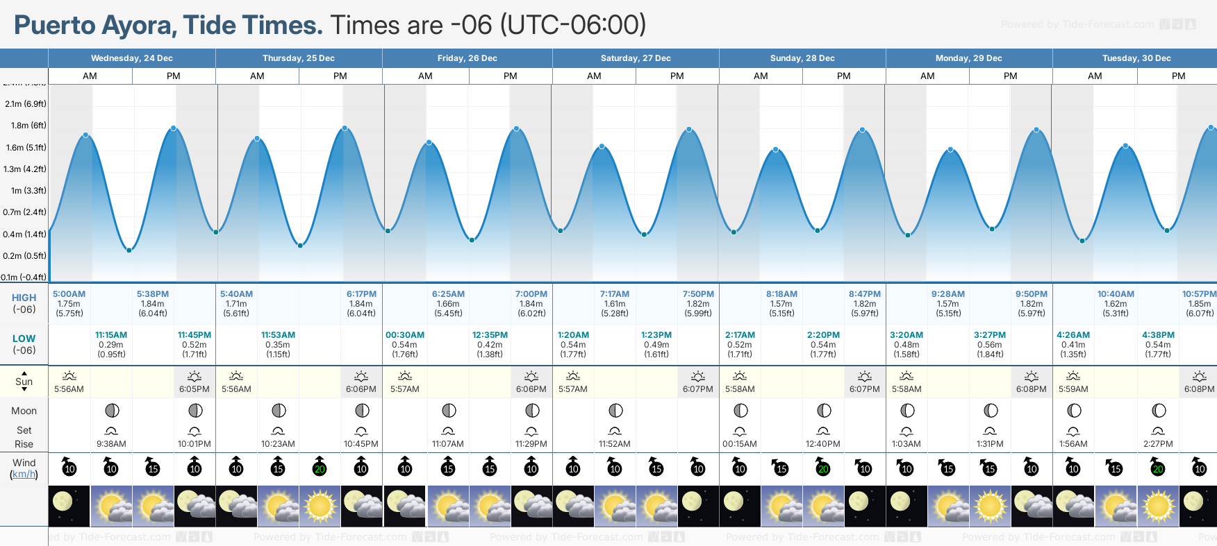 Tide chart for Puerto AyoraShowing low and high tide times for the next 30 days at Puerto Ayora. Tide Times are -06 (UTC -6.0hrs).