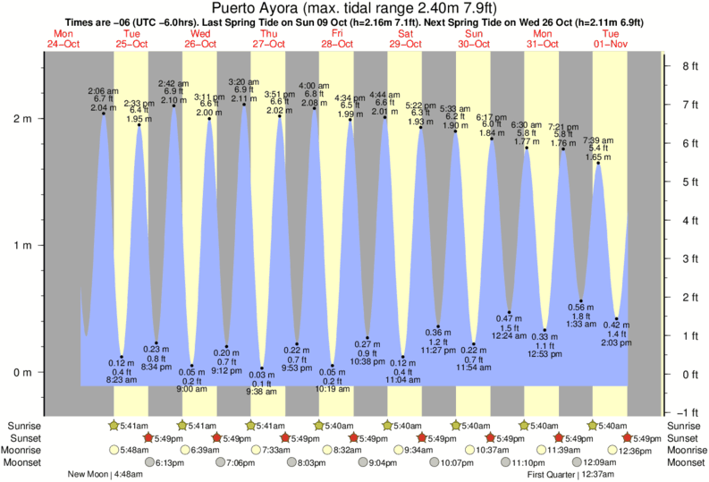 Tide Times are -06 (UTC -6.0hrs). Last Spring High Tide at Puerto Ayora was on Fri 05 Dec (height: 2.13m 7.0ft). Next high Spring Tide at Puerto Ayora will be on Tue 23 Dec (height: 1.84m 6.0ft).