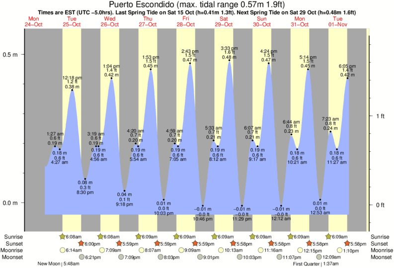 Tide Times are EST (UTC -5.0hrs). Last Spring High Tide at Puerto Escondido was on Wed 17 Dec (height: 0.41m 1.3ft). Next high Spring Tide at Puerto Escondido will be on Thu 01 Jan (height: 0.51m 1.7ft).