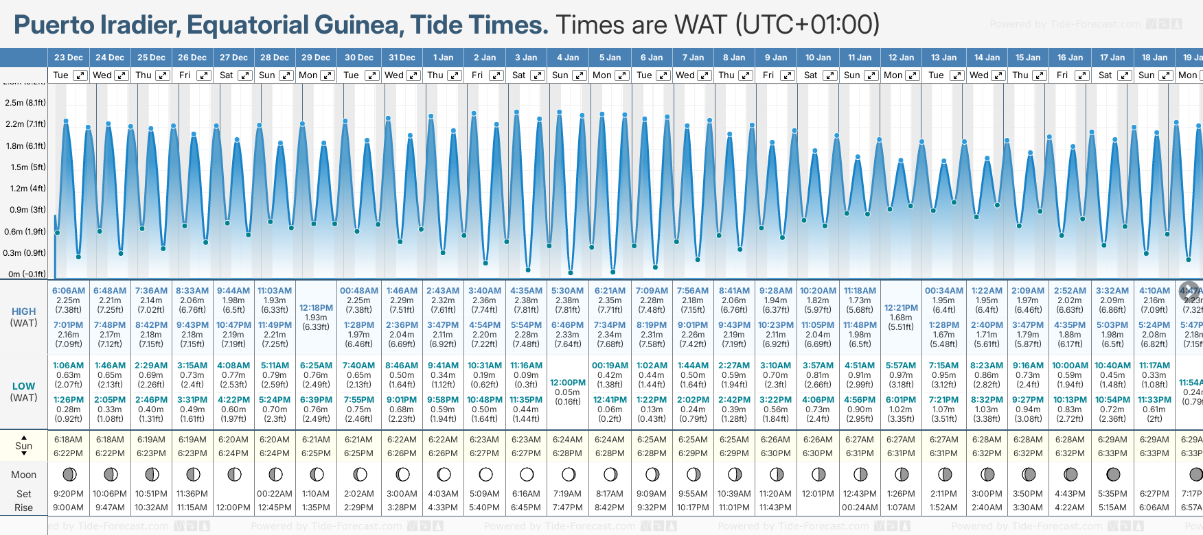 Tide Times are WAT (UTC +1.0hrs). Last Spring High Tide at Puerto Iradier was on Mon 22 Dec (height: 2.26m 7.4ft). Next high Spring Tide at Puerto Iradier will be on Sat 03 Jan (height: 2.38m 7.8ft).