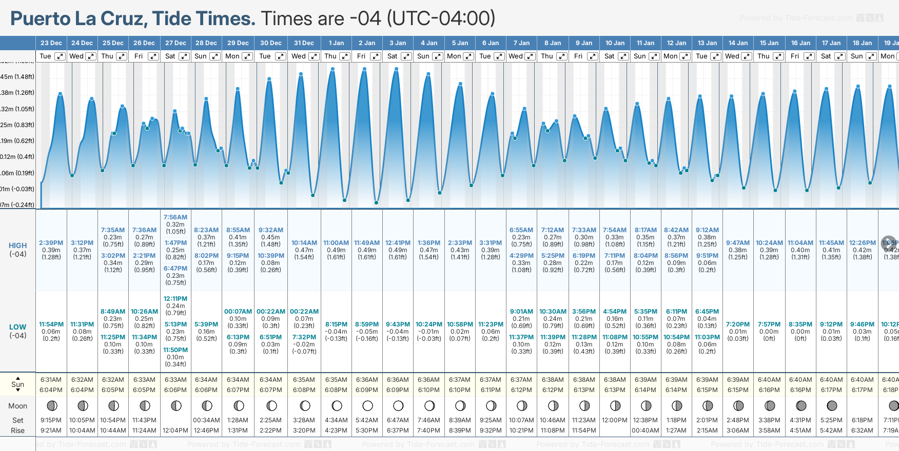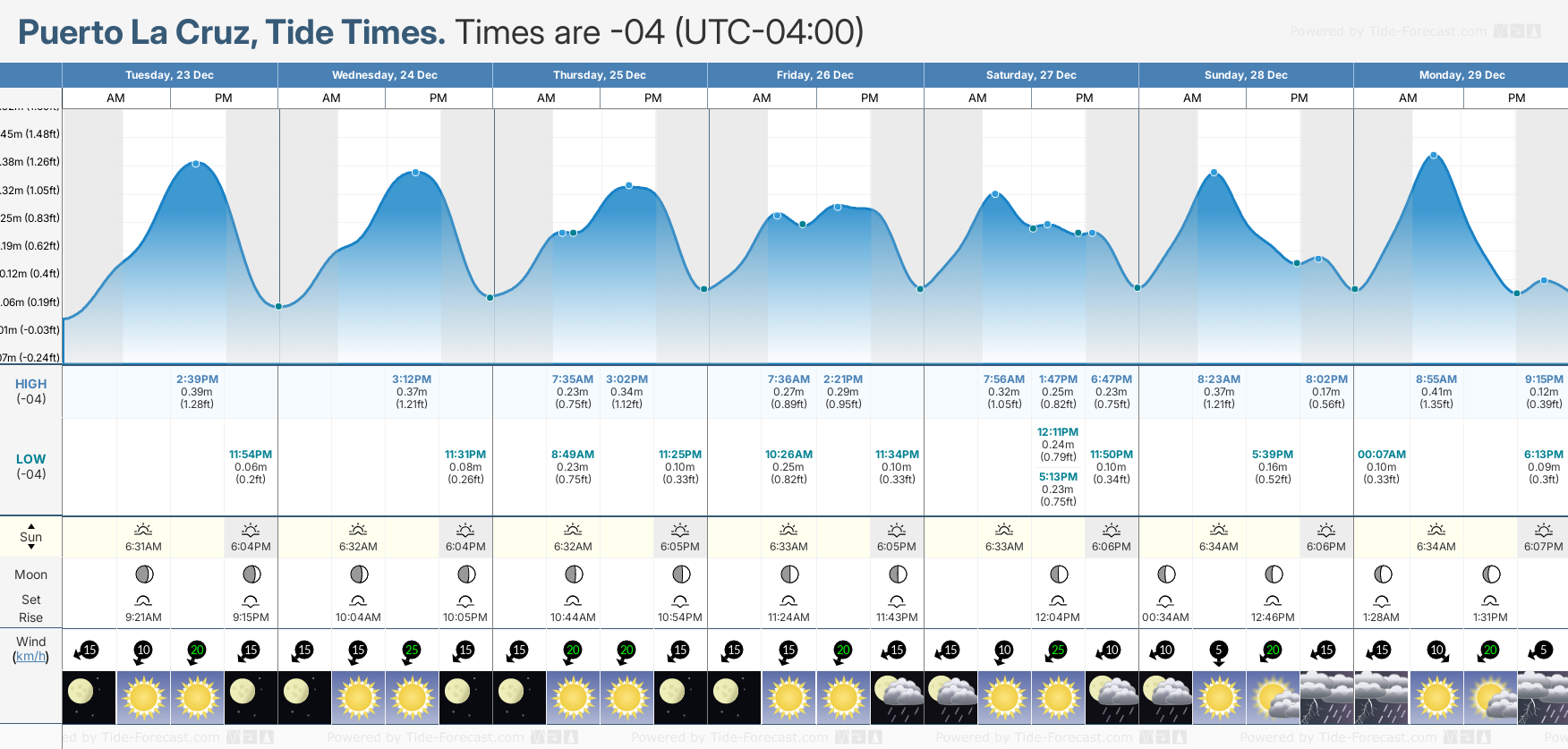 December and January Tide charts for Puerto La Cruz: The tide charts below show the height, time and date of high and low tides for the next 30 days.