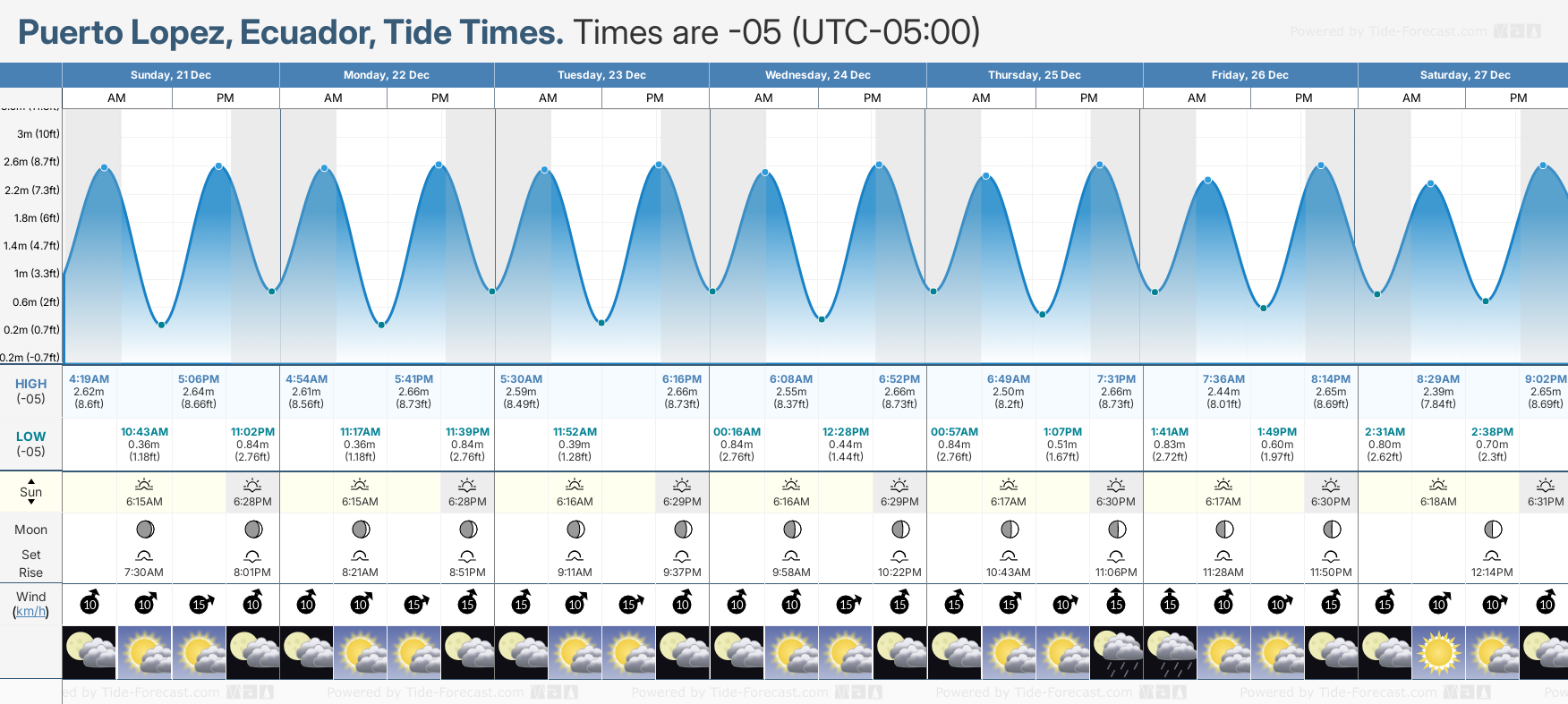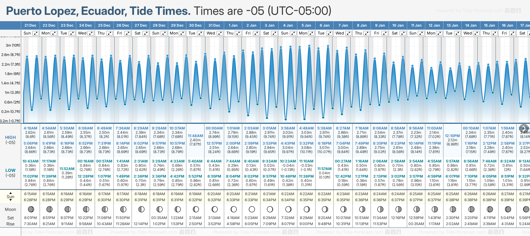 December and January Tide charts for Puerto Lopez: The tide charts below show the height, time and date of high and low tides for the next 30 days.