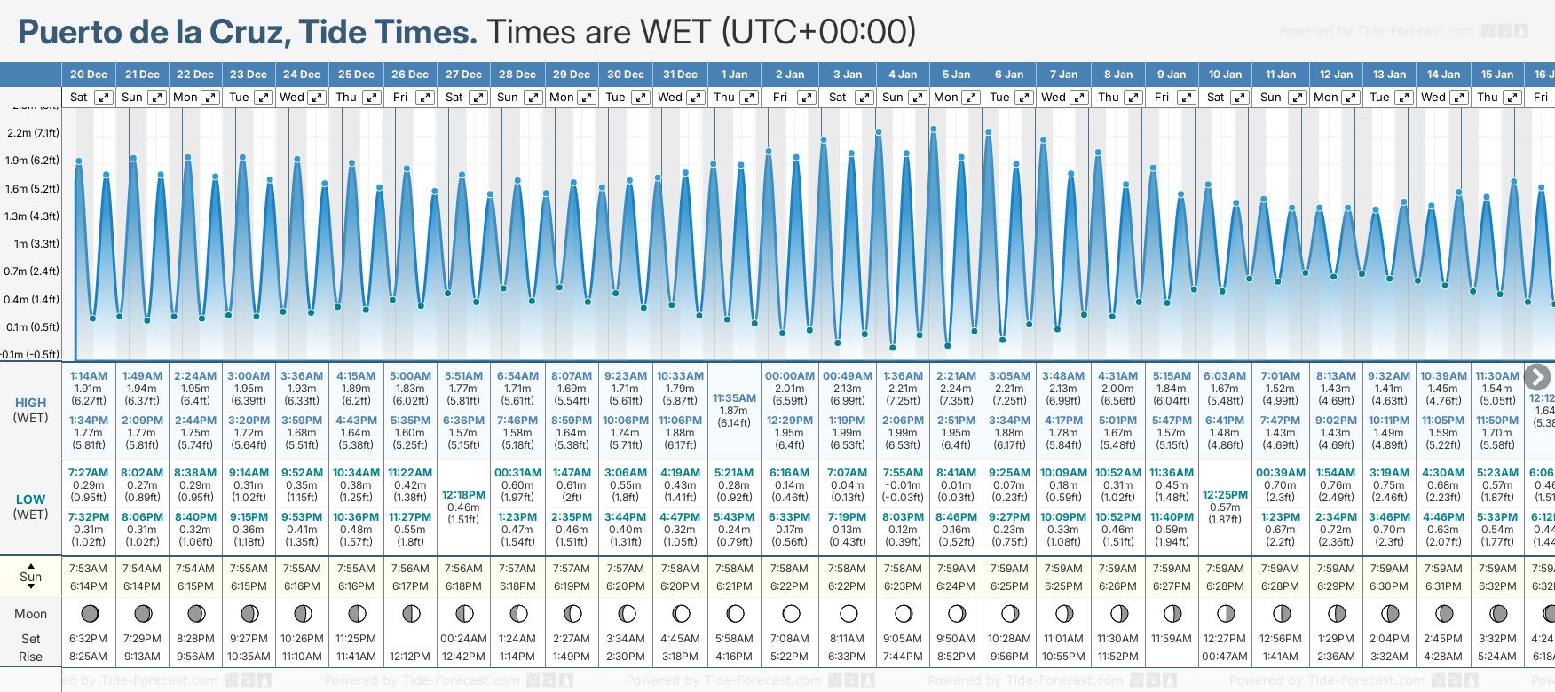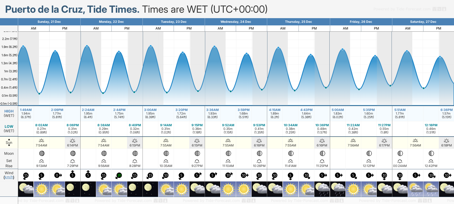 December and January Tide charts for Puerto de la Cruz: The tide charts below show the height, time and date of high and low tides for the next 30 days.