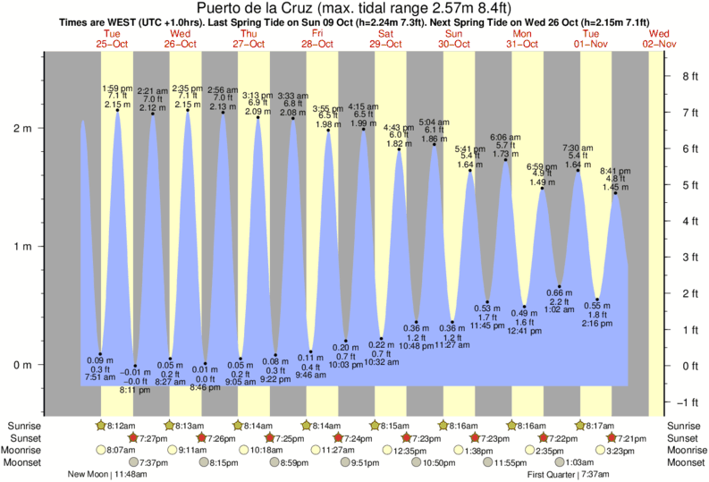 Tide chart for Puerto de la CruzShowing low and high tide times for the next 30 days at Puerto de la Cruz. Tide Times are WET (UTC +0hrs).