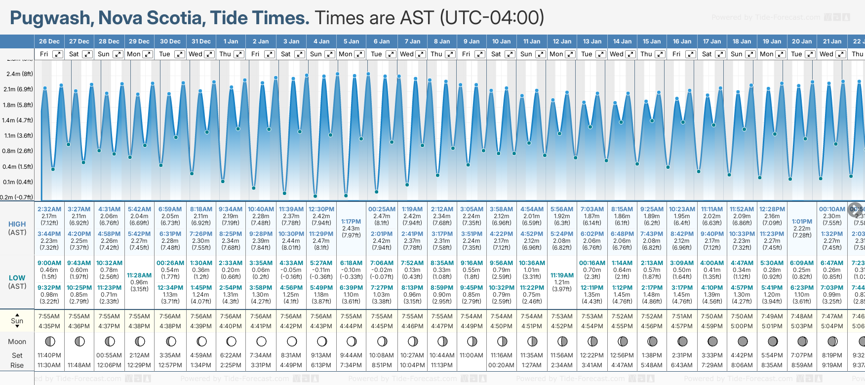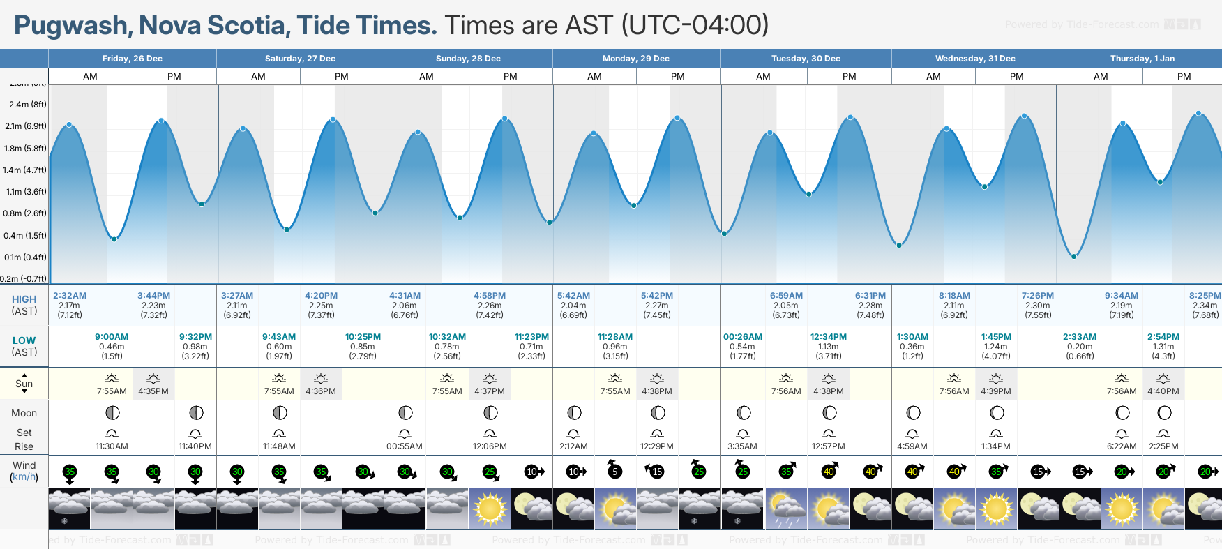 Tide chart for PugwashShowing low and high tide times for the next 30 days at Pugwash. Tide Times are AST (UTC -4.0hrs).