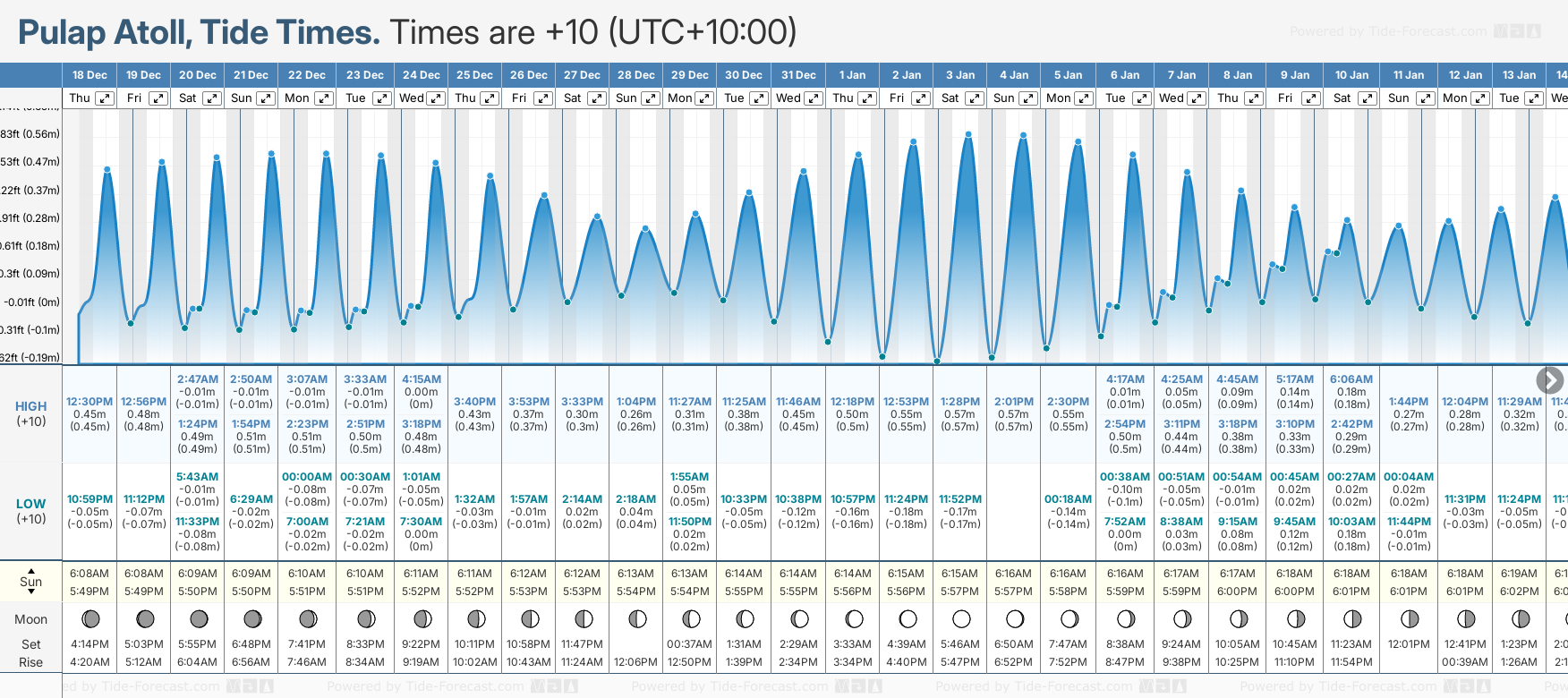 December and January Tide charts for Pulap Atoll: The tide charts below show the height, time and date of high and low tides for the next 30 days.