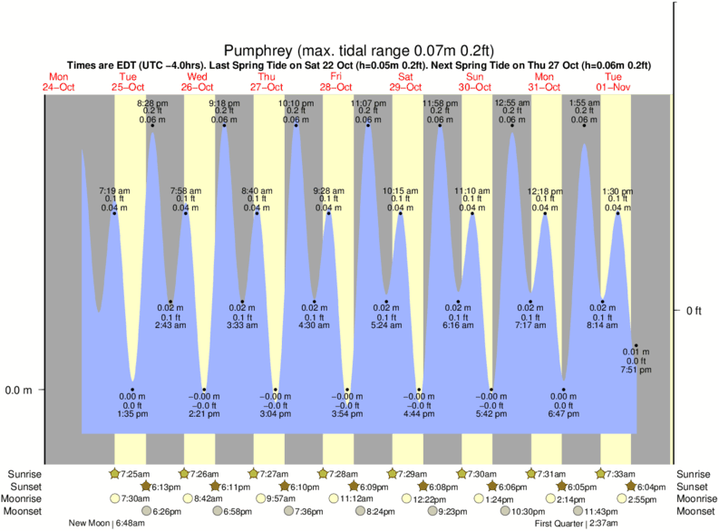 Tide Times are EST (UTC -5.0hrs). Last Spring High Tide at Pumphrey was on Thu 18 Dec (height: 0.05m 0.2ft). Next high Spring Tide at Pumphrey will be on Tue 23 Dec (height: 0.05m 0.2ft).