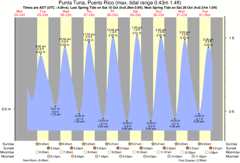 Tide Times are AST (UTC -4.0hrs). Last Spring High Tide at Punta Tuna was on Sat 06 Dec (height: 0.34m 1.1ft). Next high Spring Tide at Punta Tuna will be on Sun 21 Dec (height: 0.30m 1.0ft).