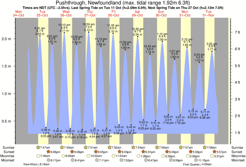 Pushthrough tide chart key: The tide chart above shows the height and times of high tide and low tide for Pushthrough, Newfoundland. The grey shading corresponds to nighttime hours between sunset and sunrise at Pushthrough.