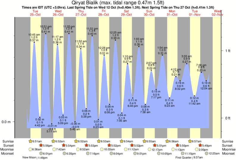 Tide Times are IST (UTC +2.0hrs). Last Spring High Tide at Qiryat Bialik was on Sat 06 Dec (height: 0.42m 1.4ft). Next high Spring Tide at Qiryat Bialik will be on Sun 21 Dec (height: 0.39m 1.3ft).