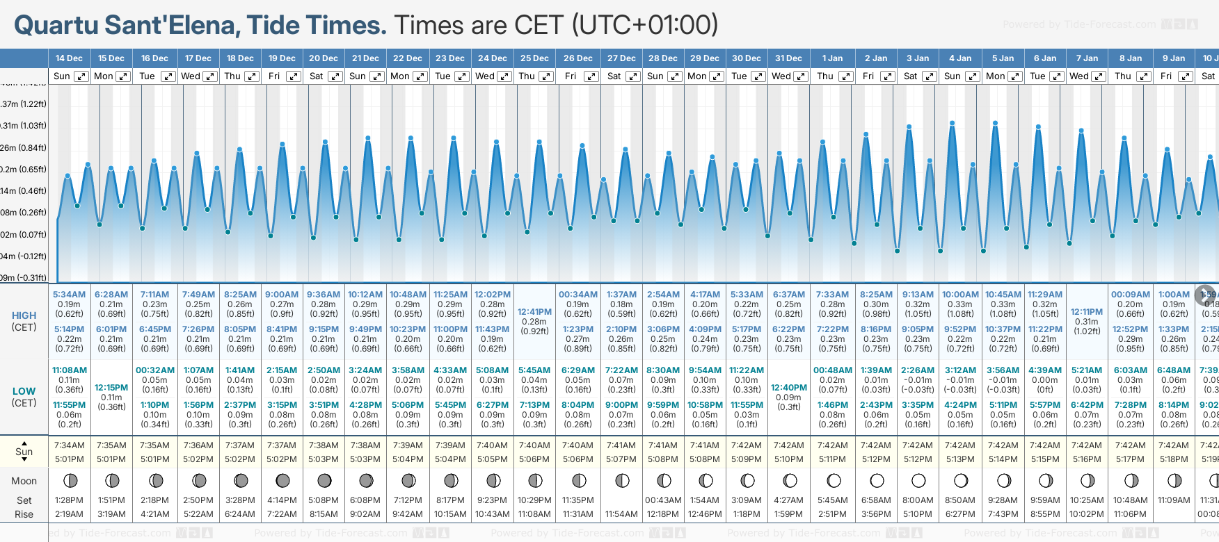 Tide chart for Quartu Sant'ElenaShowing low and high tide times for the next 30 days at Quartu Sant'Elena. Tide Times are CET (UTC +1.0hrs).