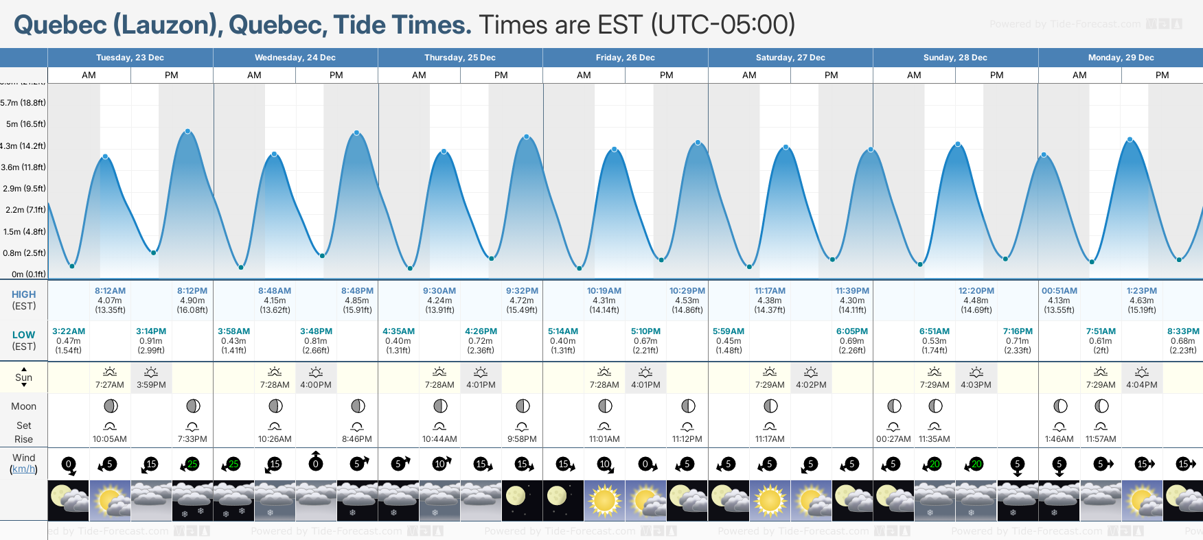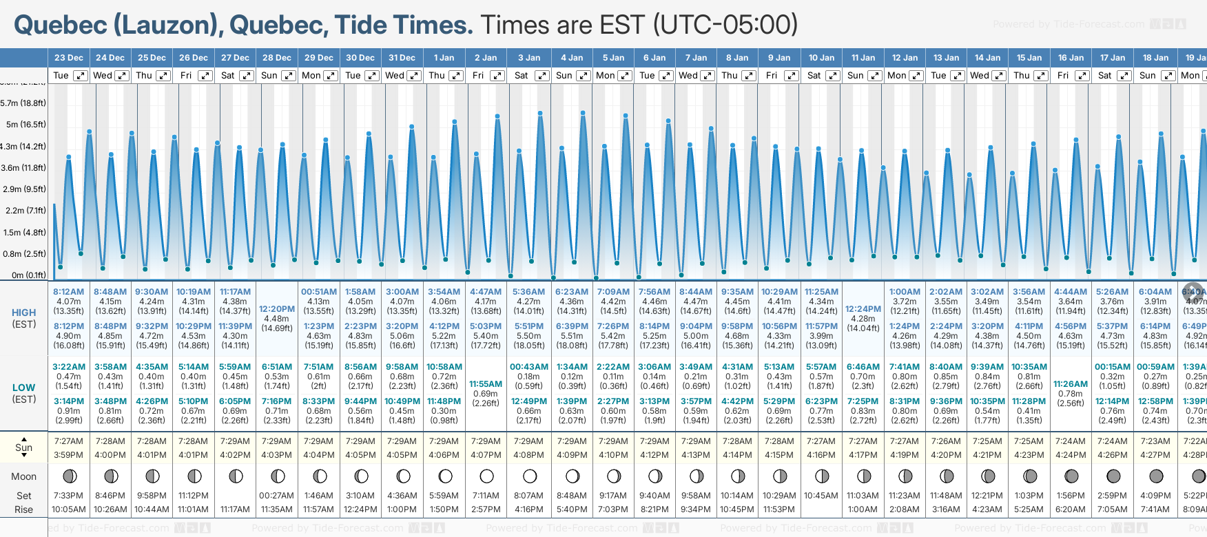 December and January Tide charts for Quebec (Lauzon): The tide charts below show the height, time and date of high and low tides for the next 30 days.