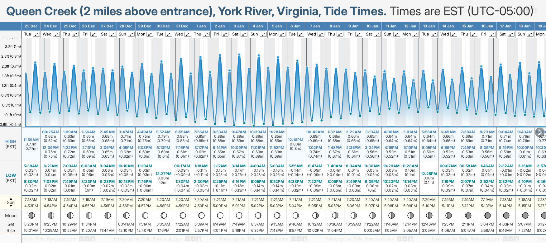 December and January Tide charts for Queen Creek (2 miles above entrance), York River: The tide charts below show the height, time and date of high and low tides for the next 30 days.