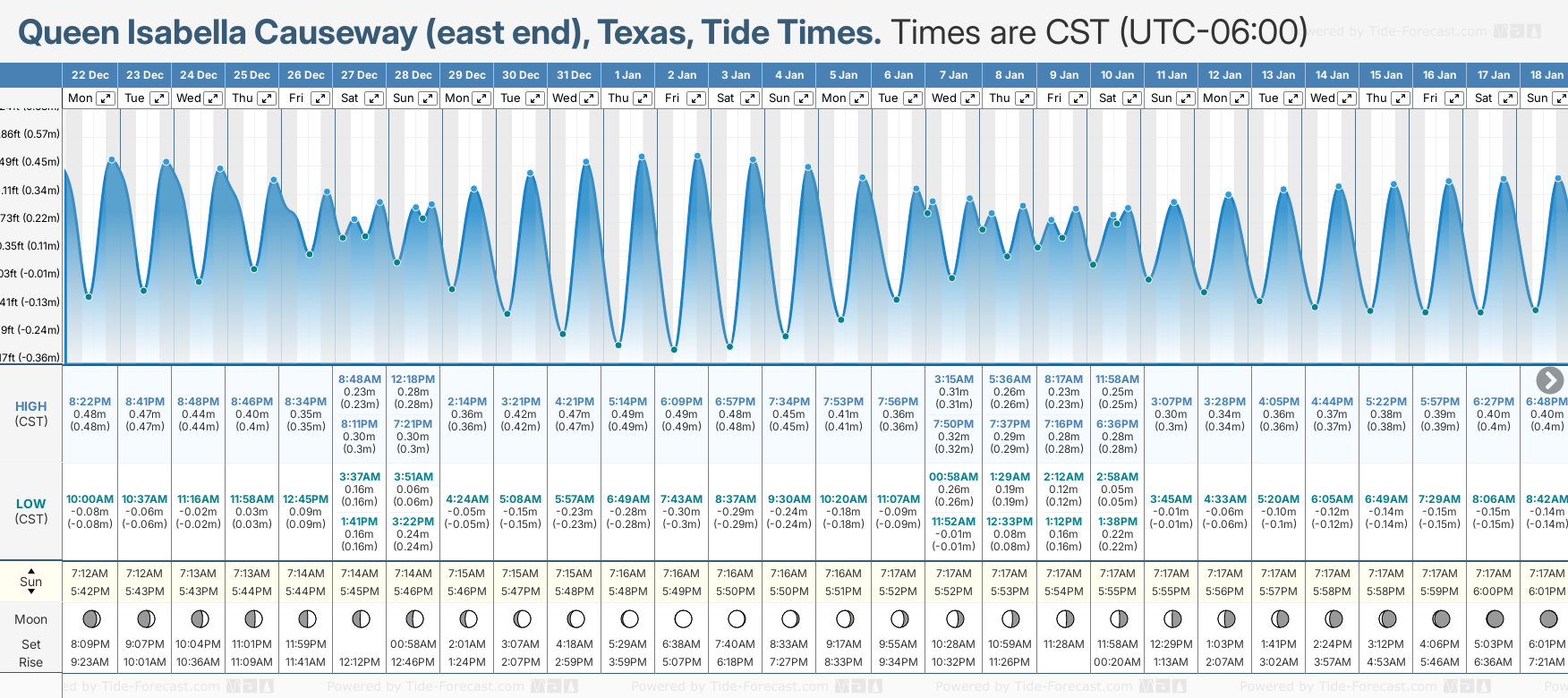 NOTE: Use of this site for Queen Isabella Causeway (east end), Texas tide times is subject to our terms.
