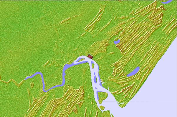 Use this relief map to navigate to tide stations, surf breaks and cities that are in the area of Quelimane, Mozambique.