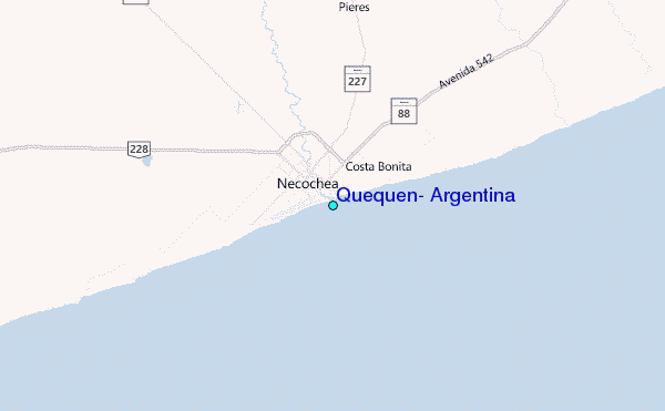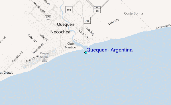 Use this relief map to navigate to tide stations, surf breaks and cities that are in the area of Quequen, Argentina.