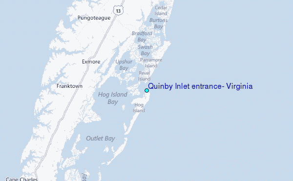 Use this relief map to navigate to tide stations, surf breaks and cities that are in the area of Quinby Inlet entrance, Virginia.