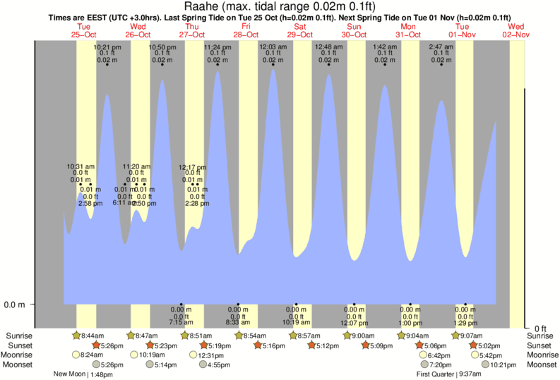 Tide Times are EET (UTC +2.0hrs). Last Spring High Tide at Raahe was on Wed 10 Dec (height: 0.02m 0.1ft). Next high Spring Tide at Raahe will be on Tue 30 Dec (height: 0.02m 0.1ft).