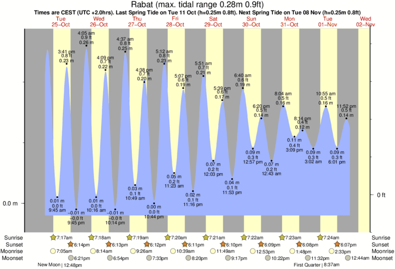 Tide Times are CET (UTC +1.0hrs). Last Spring High Tide at Rabat was on Fri 05 Dec (height: 0.25m 0.8ft). Next high Spring Tide at Rabat will be on Sun 21 Dec (height: 0.23m 0.8ft).