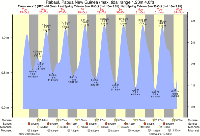 Tide Times are +10 (UTC +10.0hrs). Last Spring High Tide at Rabaul was on Mon 08 Dec (height: 1.18m 3.9ft). Next high Spring Tide at Rabaul will be on Mon 22 Dec (height: 1.16m 3.8ft).