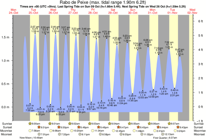 Rabo de Peixe tide chart key: The tide chart above shows the height and times of high tide and low tide for Rabo de Peixe. The grey shading corresponds to nighttime hours between sunset and sunrise at Rabo de Peixe.