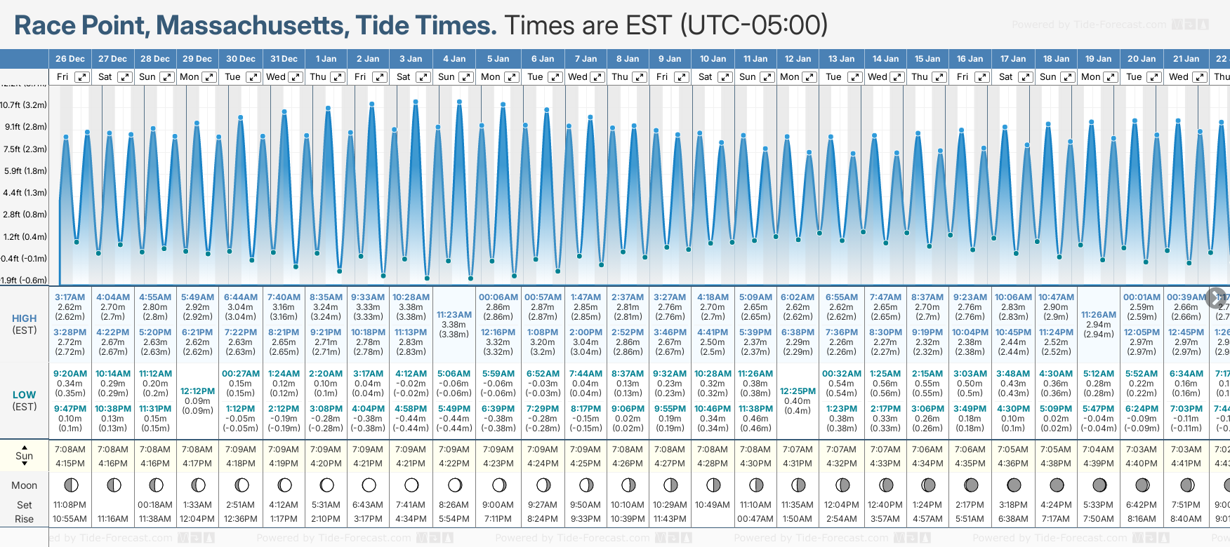 Tide Times are EST (UTC -5.0hrs). Last Spring High Tide at Race Point was on Mon 22 Dec (height: 2.87m 9.4ft). Next high Spring Tide at Race Point will be on Sat 03 Jan (height: 3.38m 11.1ft).