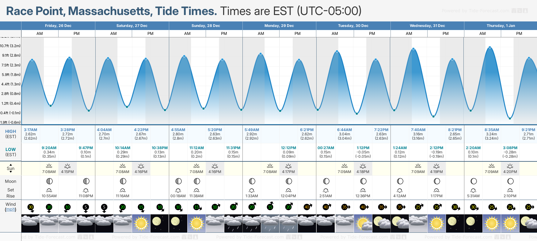 Tide chart for Race PointShowing low and high tide times for the next 30 days at Race Point. Tide Times are EST (UTC -5.0hrs).