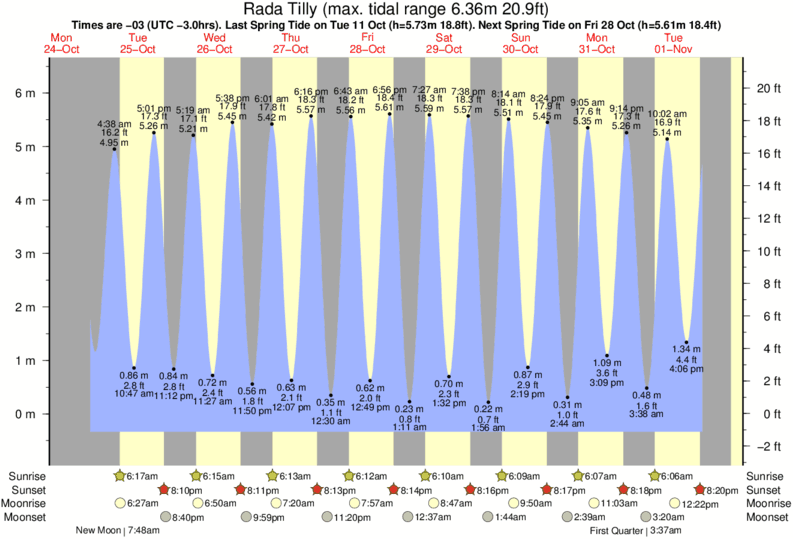 Tide Times are -03 (UTC -3.0hrs). Last Spring High Tide at Rada Tilly was on Sun 07 Dec (height: 5.98m 19.6ft). Next high Spring Tide at Rada Tilly will be on Mon 22 Dec (height: 5.17m 17.0ft).