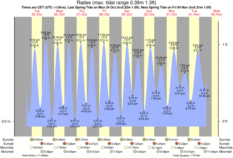 Tide Times are CET (UTC +1.0hrs). Last Spring High Tide at Rades was on Mon 08 Dec (height: 0.34m 1.1ft). Next high Spring Tide at Rades will be on Sun 21 Dec (height: 0.31m 1.0ft).