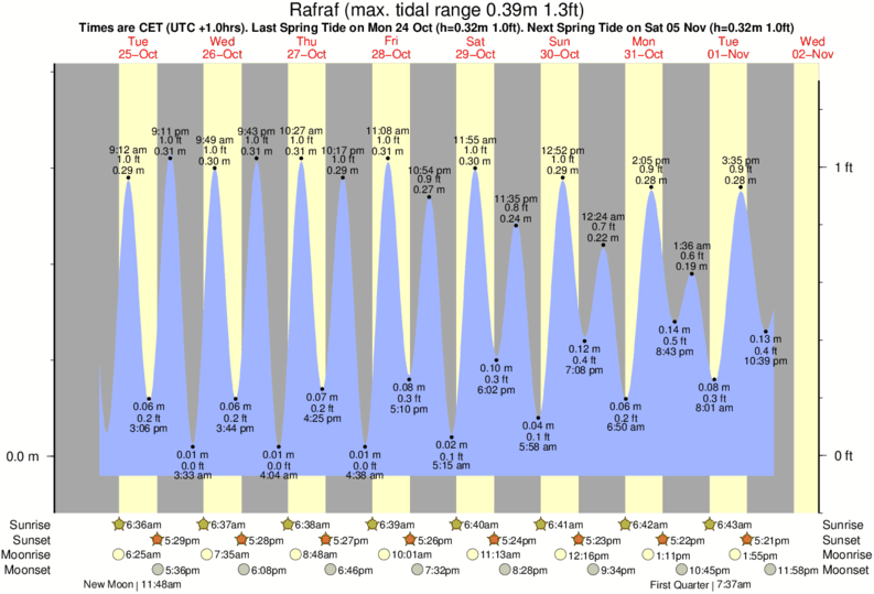 Tide Times are CET (UTC +1.0hrs). Last Spring High Tide at Rafraf was on Mon 08 Dec (height: 0.34m 1.1ft). Next high Spring Tide at Rafraf will be on Mon 22 Dec (height: 0.31m 1.0ft).