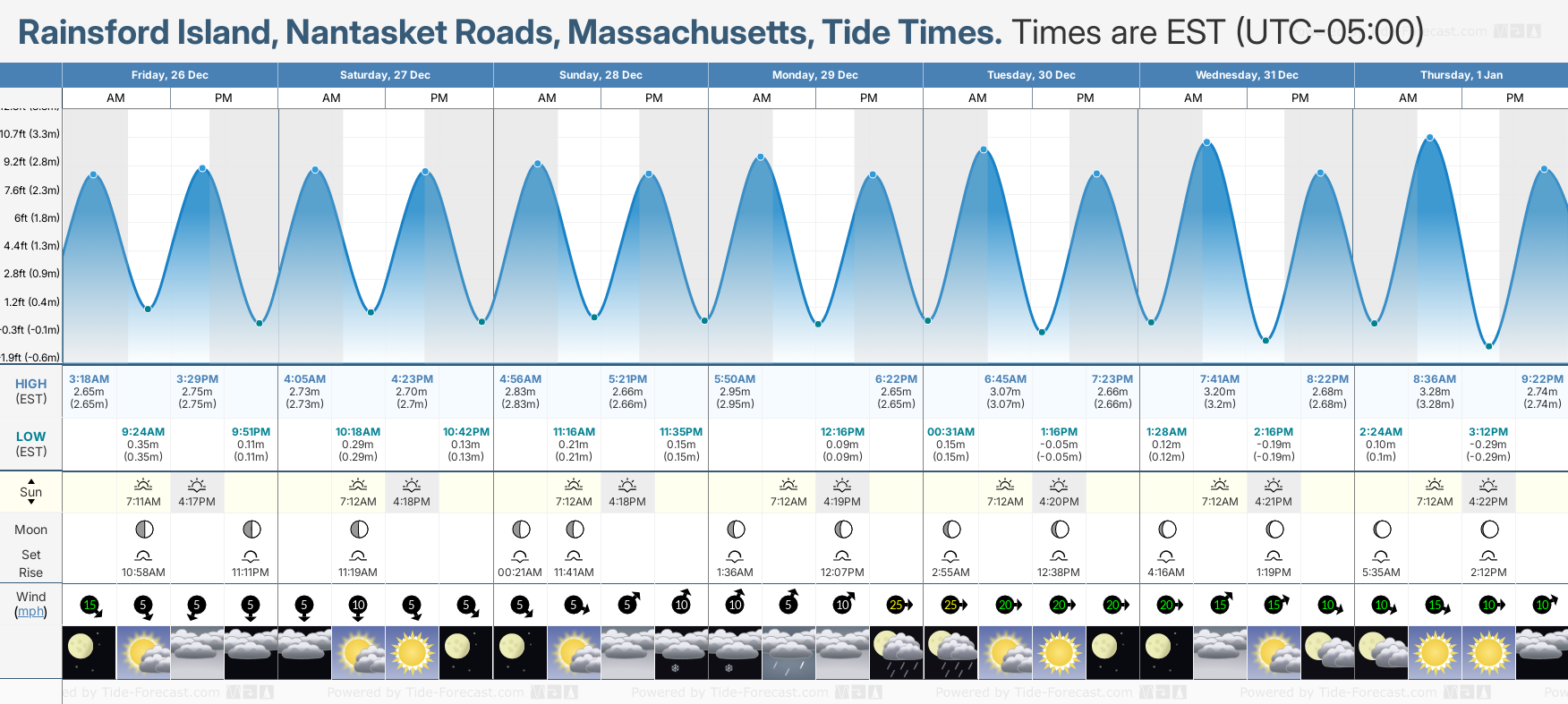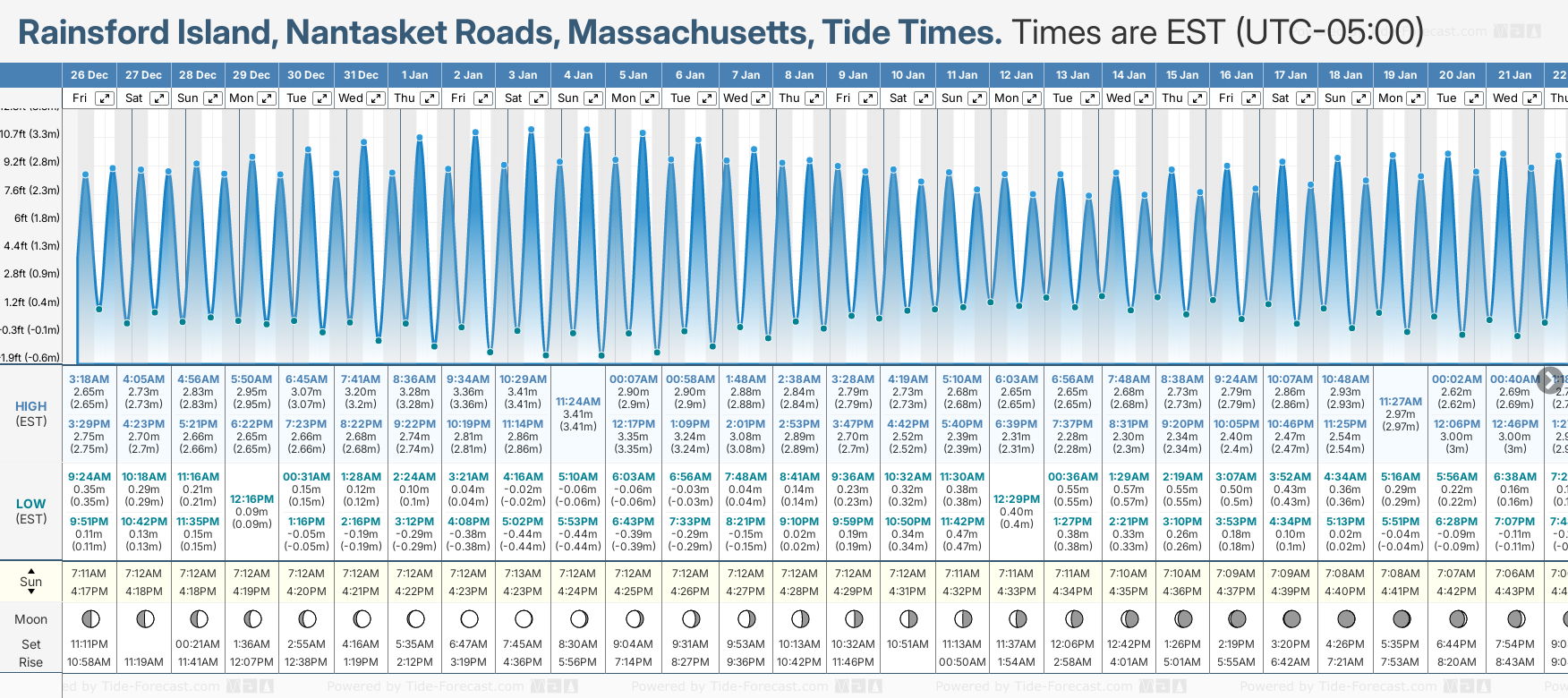 December and January Tide charts for Rainsford Island, Nantasket Roads: The tide charts below show the height, time and date of high and low tides for the next 30 days.