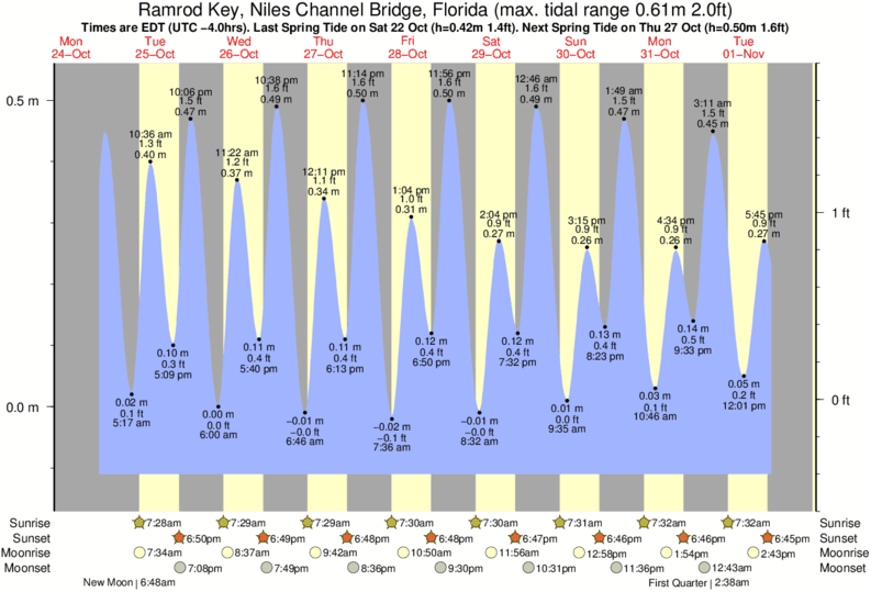 Tide Times are EST (UTC -5.0hrs). Last Spring High Tide at Ramrod Key, Niles Channel Bridge was on Sat 06 Dec (height: 0.48m 1.6ft). Next high Spring Tide at Ramrod Key, Niles Channel Bridge will be on Sat 20 Dec (height: 0.38m 1.2ft).