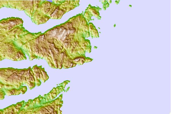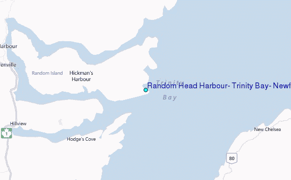 Use this relief map to navigate to tide stations, surf breaks and cities that are in the area of Random Head Harbour, Trinity Bay, Newfoundland.