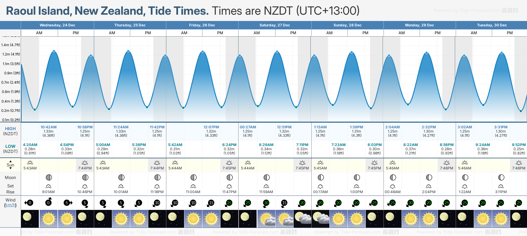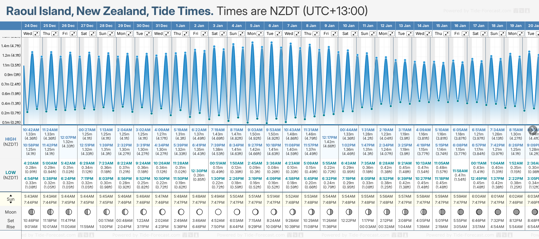 December and January Tide charts for Raoul Island: The tide charts below show the height, time and date of high and low tides for the next 30 days.