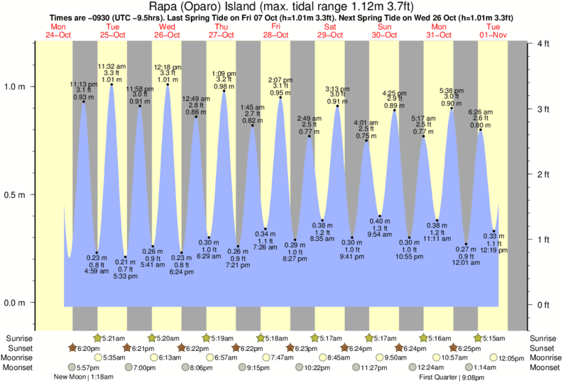 Tide Times are -0930 (UTC -9.5hrs). Last Spring High Tide at Rapa (Oparo) Island was on Thu 04 Dec (height: 1.10m 3.6ft). Next high Spring Tide at Rapa (Oparo) Island will be on Sat 20 Dec (height: 0.90m 3.0ft).