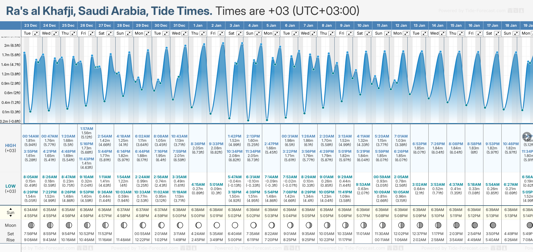 Tide Times are +03 (UTC +3.0hrs). Last Spring High Tide at Ra's al Khafji was on Sun 21 Dec (height: 1.87m 6.1ft). Next high Spring Tide at Ra's al Khafji will be on Sat 03 Jan (height: 2.08m 6.8ft).