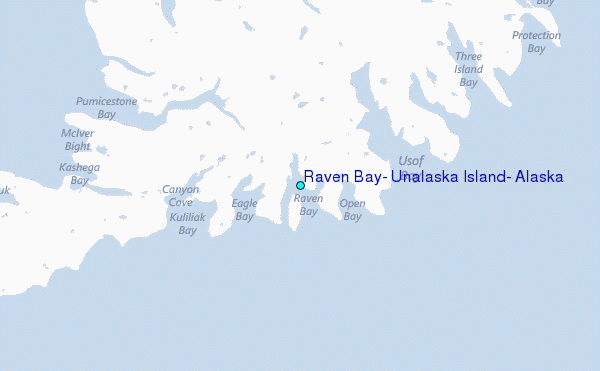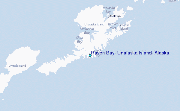 Use this relief map to navigate to tide stations, surf breaks and cities that are in the area of Raven Bay, Unalaska Island, Alaska.