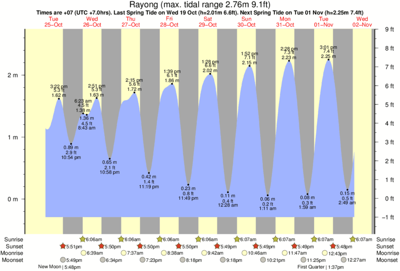 Tide Times are +07 (UTC +7.0hrs). Last Spring High Tide at Rayong was on Sun 07 Dec (height: 2.43m 8.0ft). Next high Spring Tide at Rayong will be on Tue 23 Dec (height: 2.23m 7.3ft).